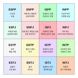 - 판단(J) vs 인식(P) : 계획적인 루틴 vs 즉흥적인 자유로움